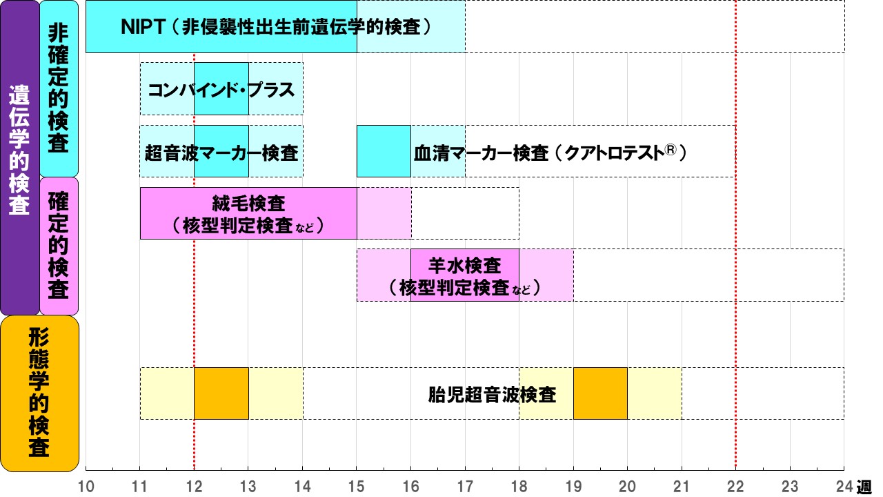 - ※1. 当院は①妊娠15週、②妊娠16~17週で絨毛膜羊膜分離や羊水過少がある場合、は絨毛検査を推奨しています。