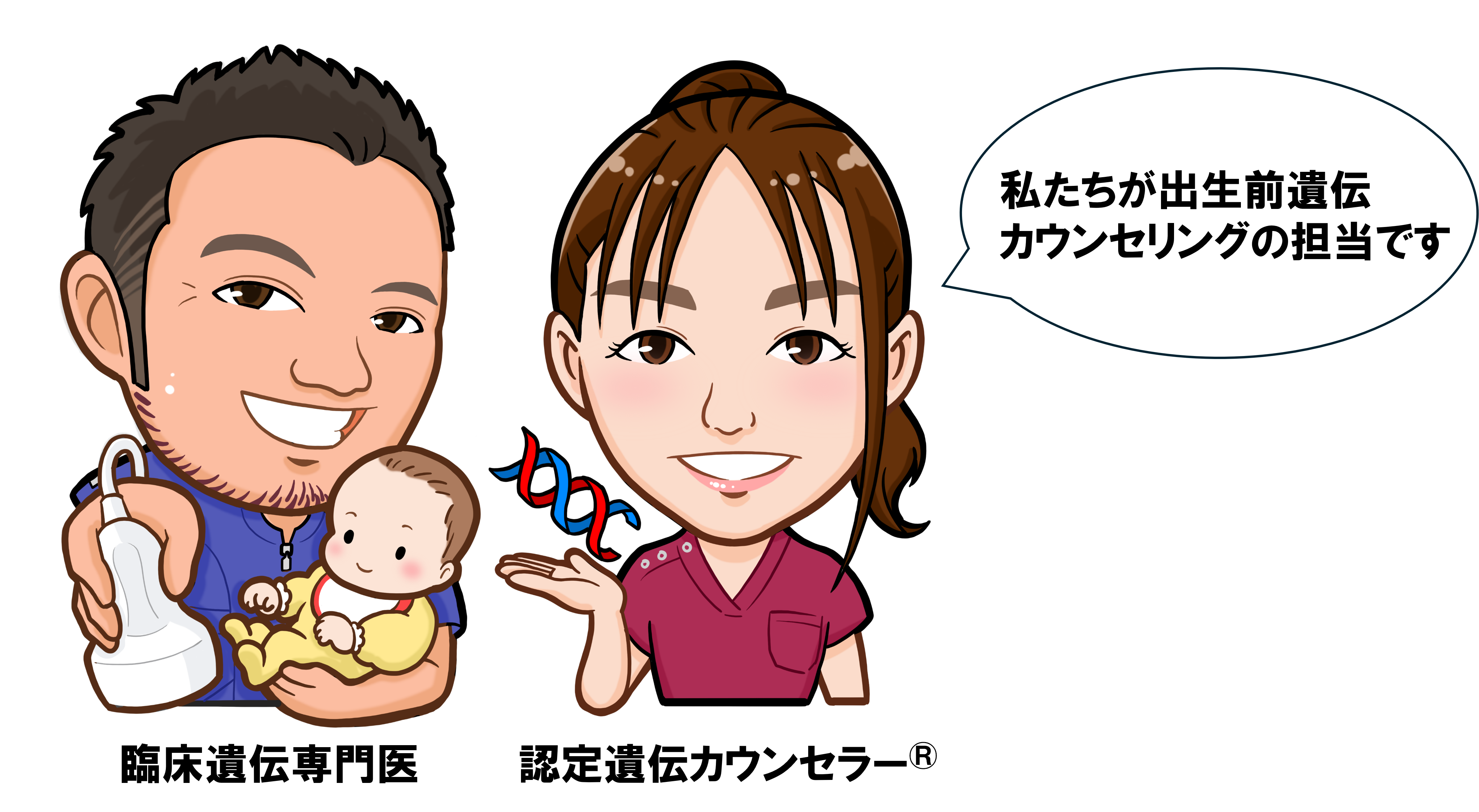 遺伝カウンセリングは、依頼者のニーズに対応する遺伝学的情報などを提供し、依頼者がそれを十分に理解した上で自ら意思決定できるように援助する医療行為です。出生前遺伝カウンセリングは妊娠女性・配偶者・お子さまの三者の立場を同時に考える必要があり、妊娠を継続するか(できるか)の是非と関連し、限られた時間で重大な決断を迫られる可能性がある、という特徴を有します。
